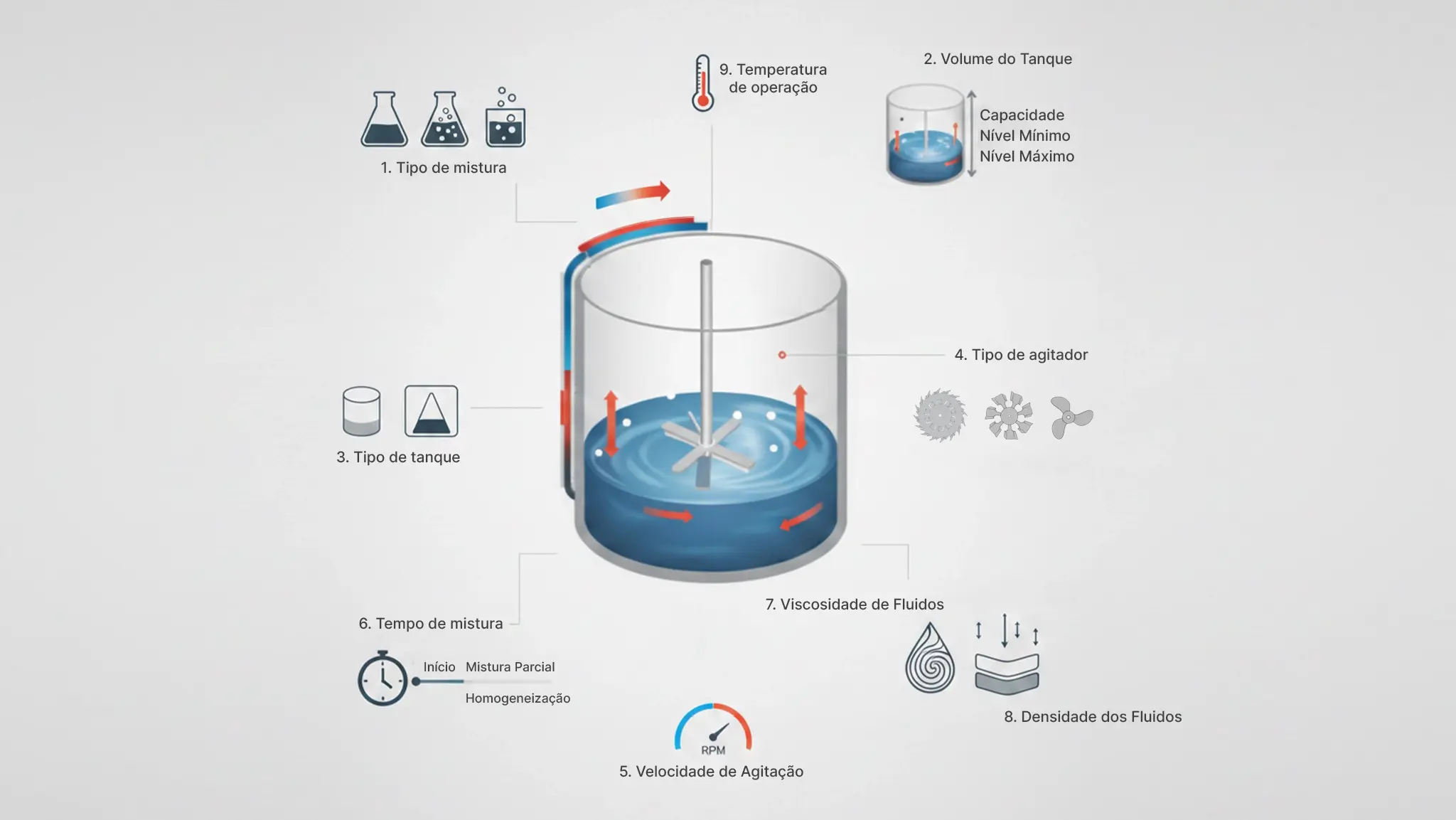 - Escolha do agitador: Selecione o tipo de agitador mais adequado para o tipo de mistura, a viscosidade dos fluidos e o volume do tanque.