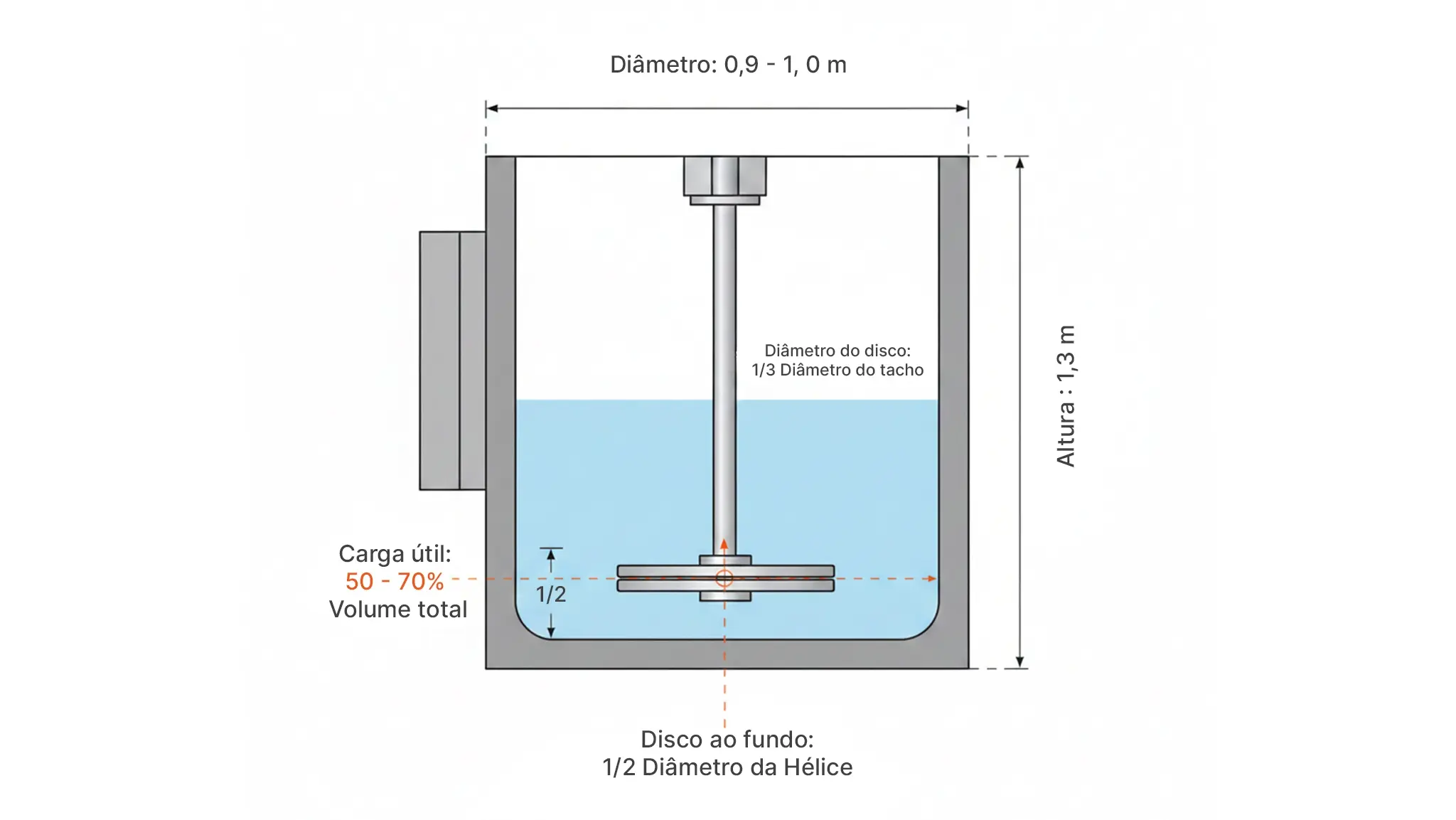 A distância do disco ao fundo do tacho deve ser de 1/2 diâmetro do disco.