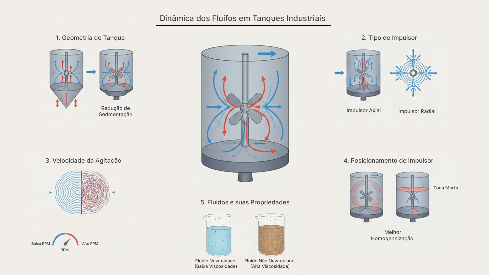 Fluidos e suas Propriedades: As propriedades físicas dos fluidos (viscosidade, densidade, tensão superficial) são parâmetros-chave na determinação do tipo de impulsor e da velocidade de agitação. Fluidos não-newtonianos, por exemplo, exigem considerações adicionais devido ao seu comportamento reológico complexo.