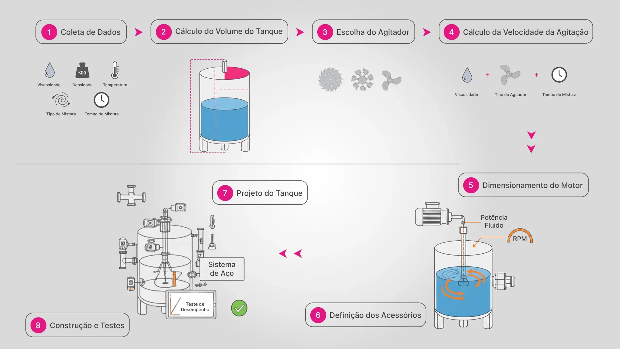 - Coleta de dados: Reúna todas as informações necessárias sobre os materiais a serem misturados, o tipo de mistura desejada, o volume do tanque, a forma do tanque, a viscosidade e densidade dos fluidos, a temperatura de operação e o tempo de mistura desejado.