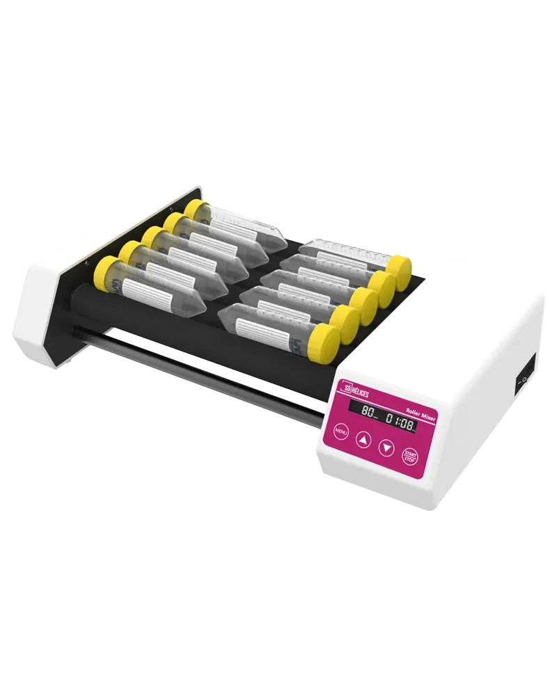 O misturador roller é projetado com 6 rolos de sílica gel de alta qualidade, garantindo um funcionamento suave e estável. Seu exclusivo modo de operação, que combina balanço e rolamento, assegura uma homogeneização completa e eficiente das amostras.